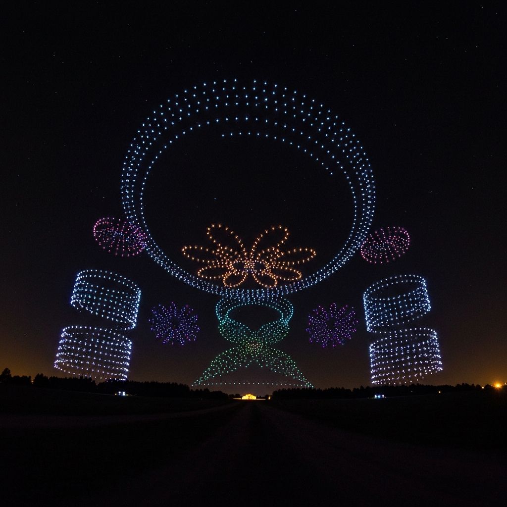 Synchronized light shows and aerial displays with choreographed formations and effects.